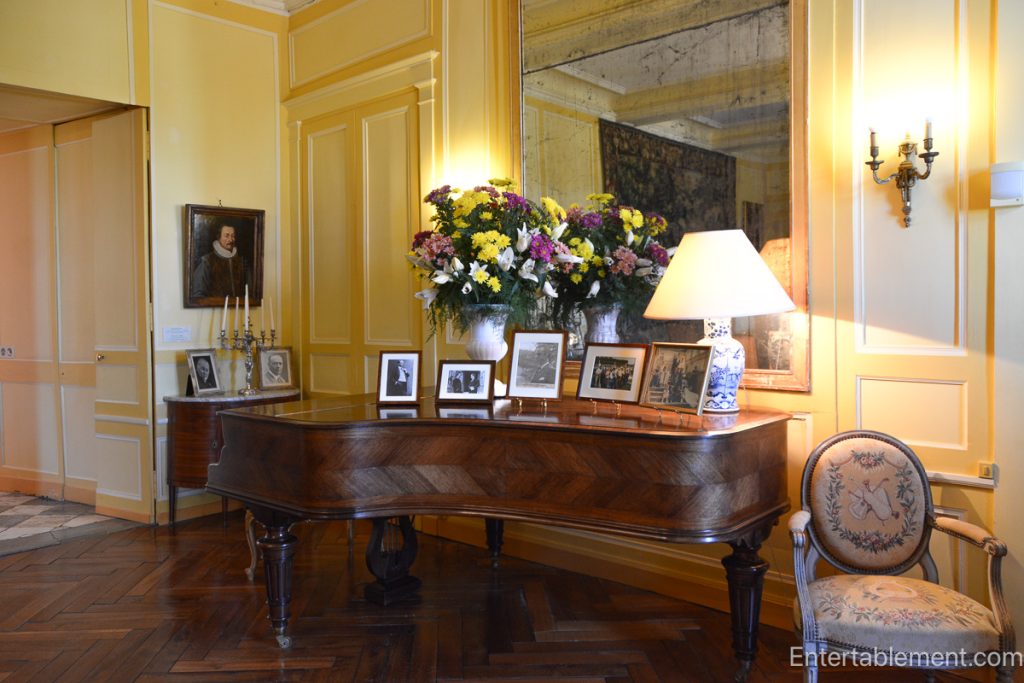 The grand piano topped with black-and-white family photographs is a perfect metaphor: opulence and intimacy share the same stage.