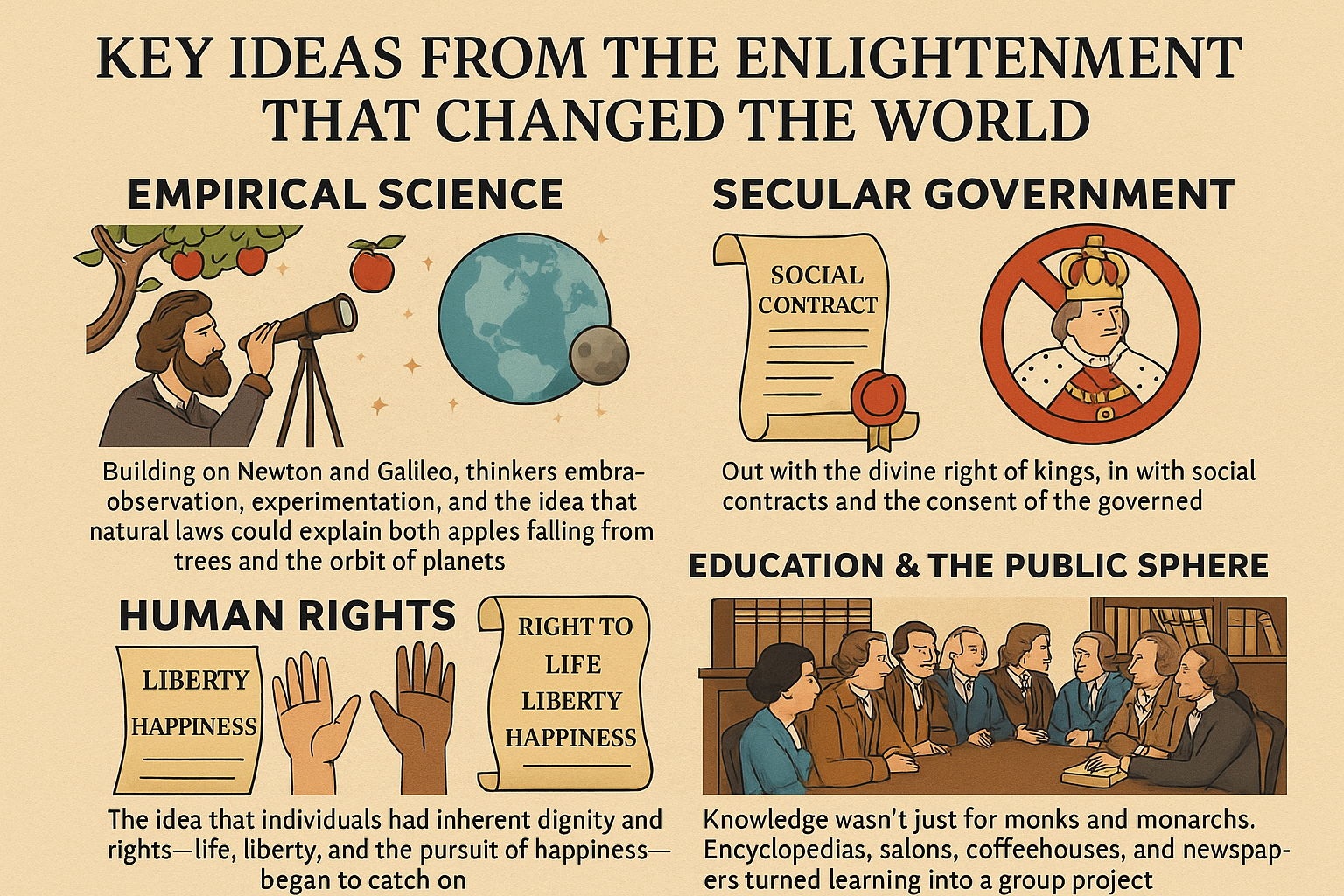 - Empirical Science: Building on Newton and Galileo, thinkers embraced observation, experimentation, and the idea that natural laws could explain both apples falling from trees and the orbit of planets.