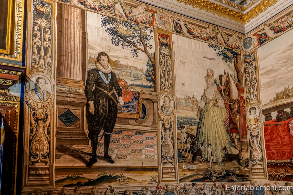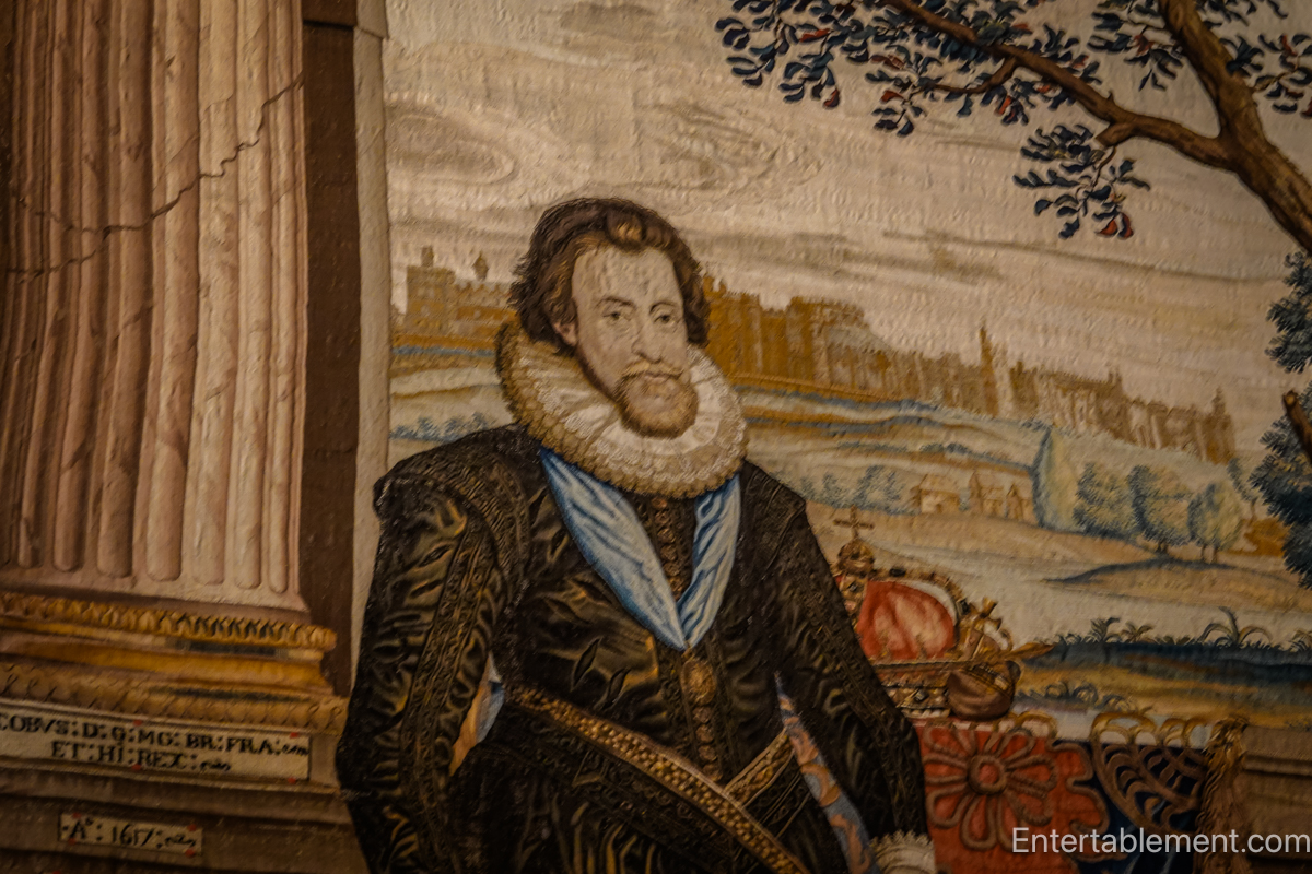 The set of five unique tapestries depicts portraits of James I/James VI of Scotland and Anne of Denmark (below). Medallions of Stuart children are sewn in the “pilasters” on the tapestries.