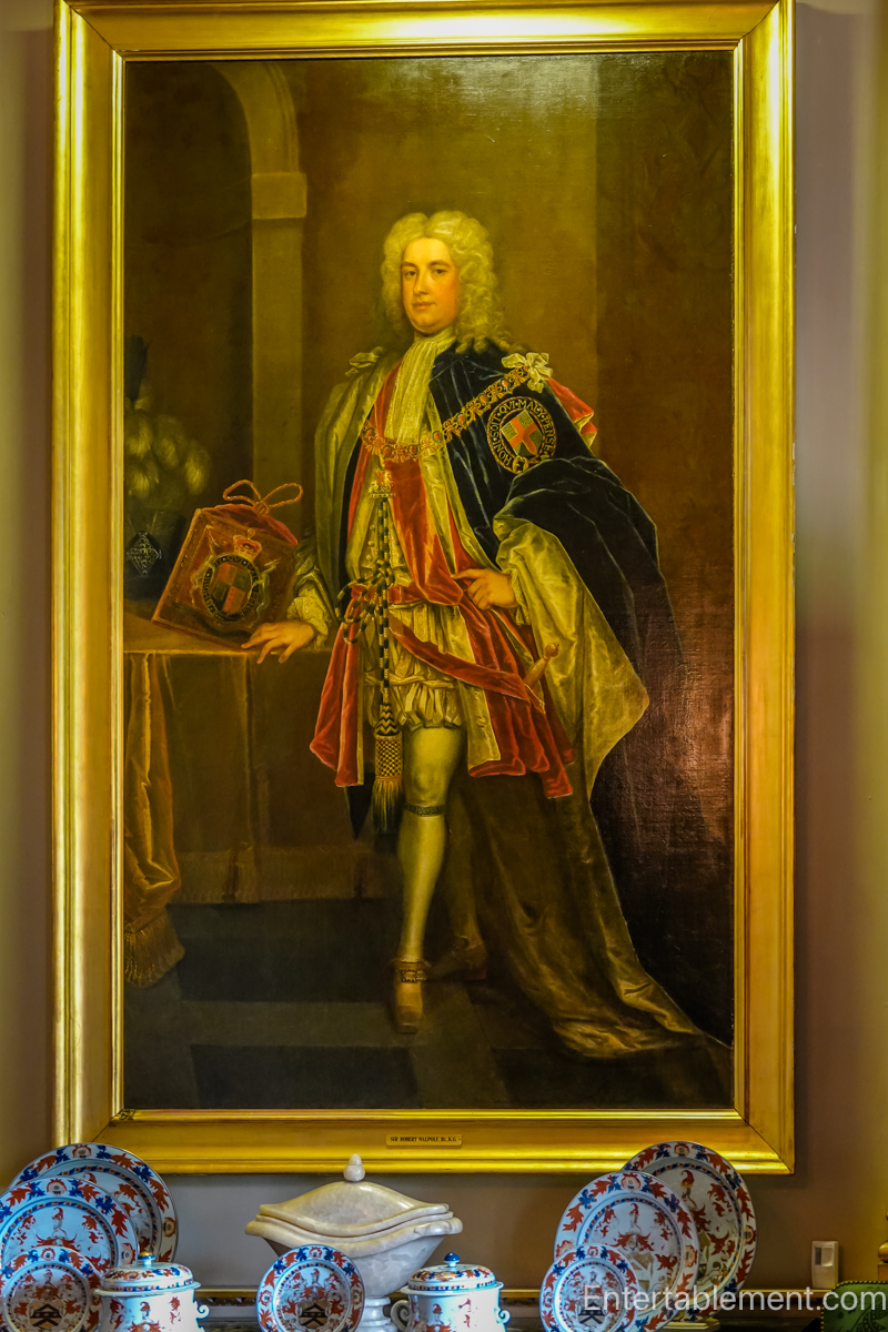 The portrait of Sir Robert in the robes of the Order of the Garter is “in the school of” Kneller.