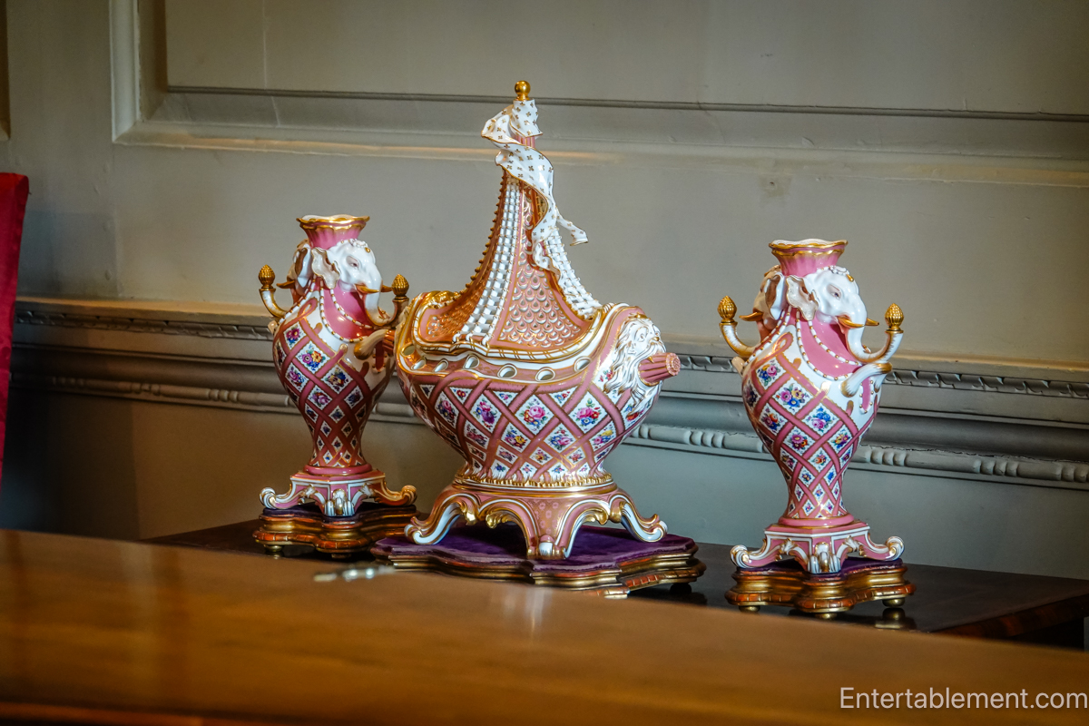 One of its most intriguing decorative elements is a striking pink-ground porcelain garniture set, featuring a central ship-shaped potpourri vase and two accompanying urns with elephant’s head handles.