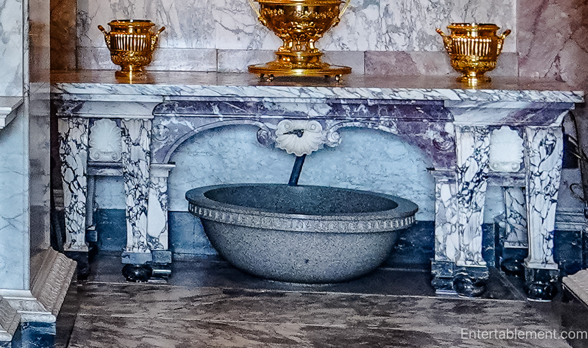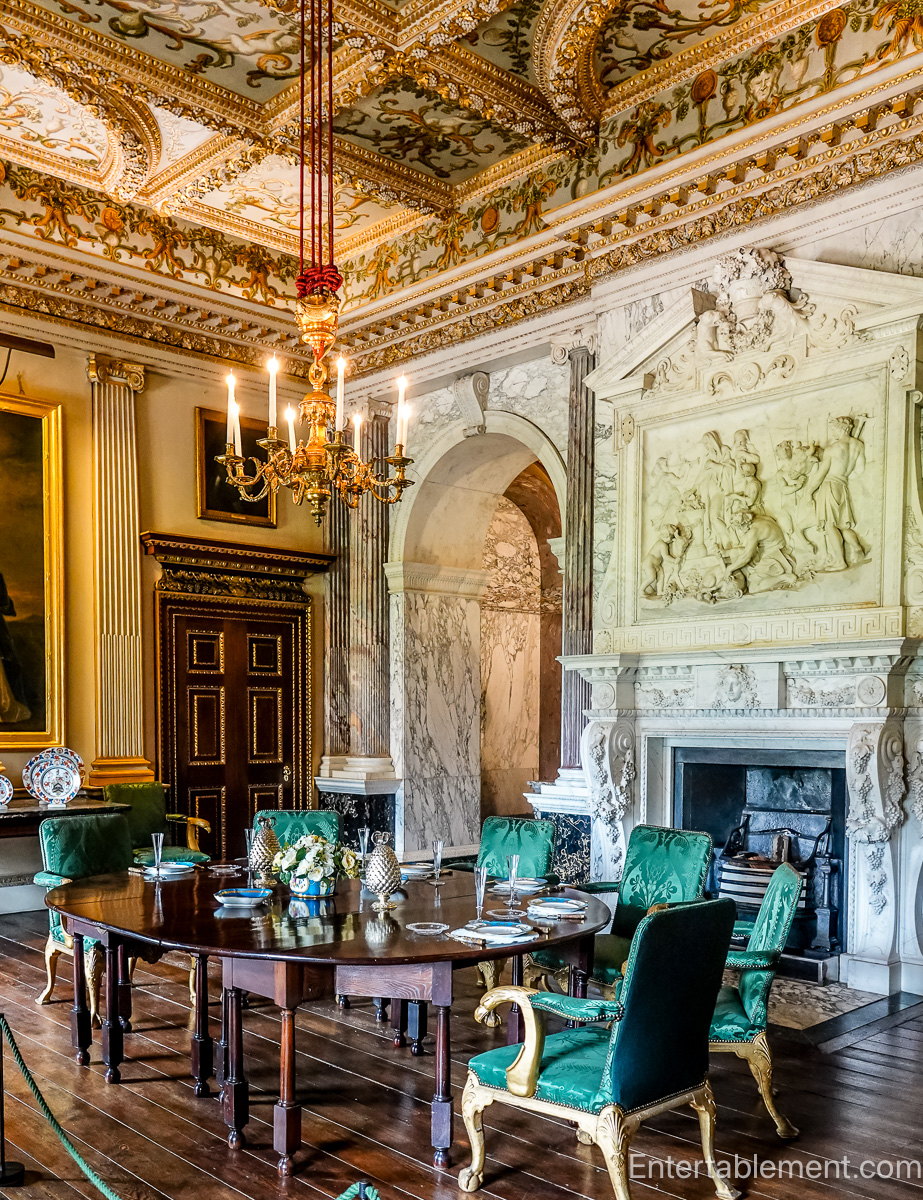 Behind the chimney breast is access for servants, just as Gibbs planned it, in a flash of practicality. I imagine the large grey marble container beneath the table acted as a wine cooler.