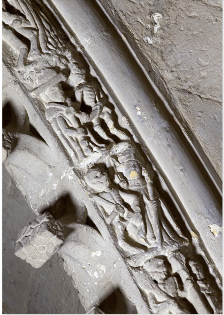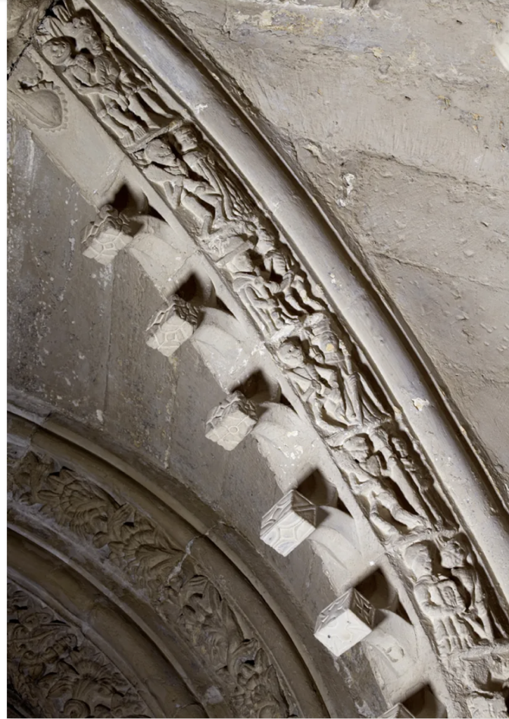 For balance, there is another lintel showing the seven acts of mercy. From left to right, you will see a bishop performing the following acts of mercy: