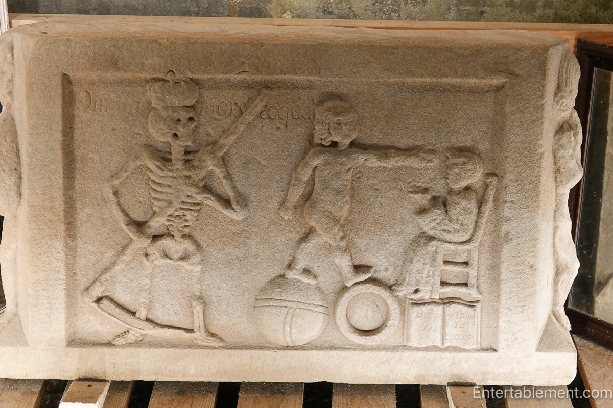 One of the most fascinating stones in the crypt is the ‘King of Terrors’, an intricately carved slab depicting the transition from life to death. The Latin inscription “Omnia Mors Aequat” translates to “Death renders all equal.” The skeleton wearing a crown and holding the sythe represents death. To the right, humans step off the earthly plane to the spiritual plane, met by judgement holding a book.