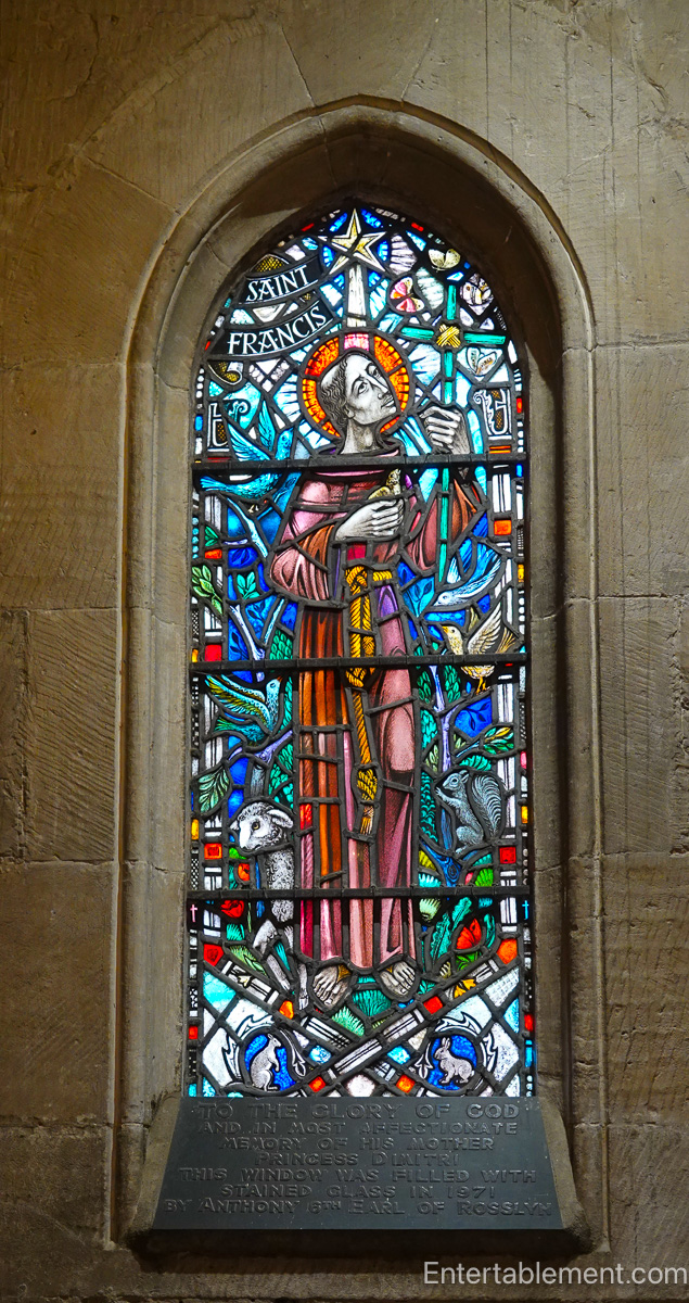 In 1869, the Earl commissioned additional glass for the chapel’s east window, illustrating the Resurrection of Christ. Other windows added in the 20th century include designs by William Wilson, featuring St. Andrew and St. George.