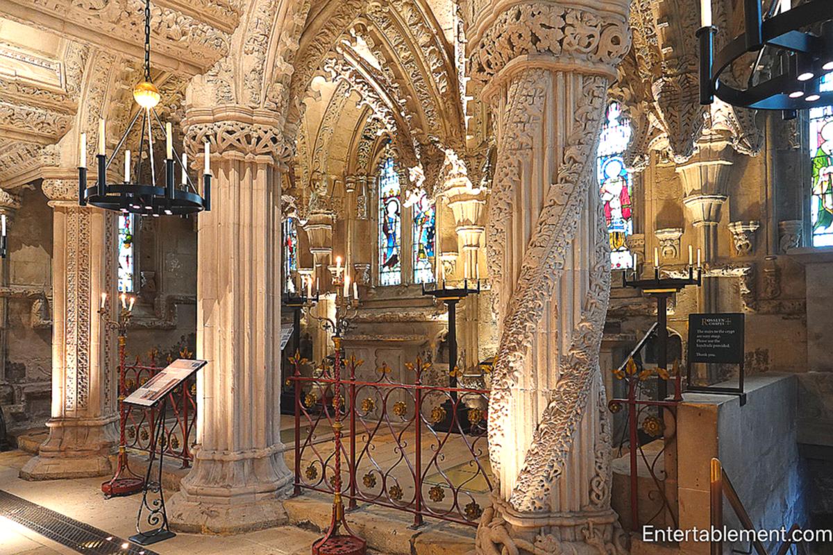 In the master’s absence, the apprentice, inspired by a dream, carved this pillar—the medieval equivalent of “hold my beer.” Rosslyn’s most famous feature is a stunningly ornate column wrapped in spiraling, vine-like carvings.