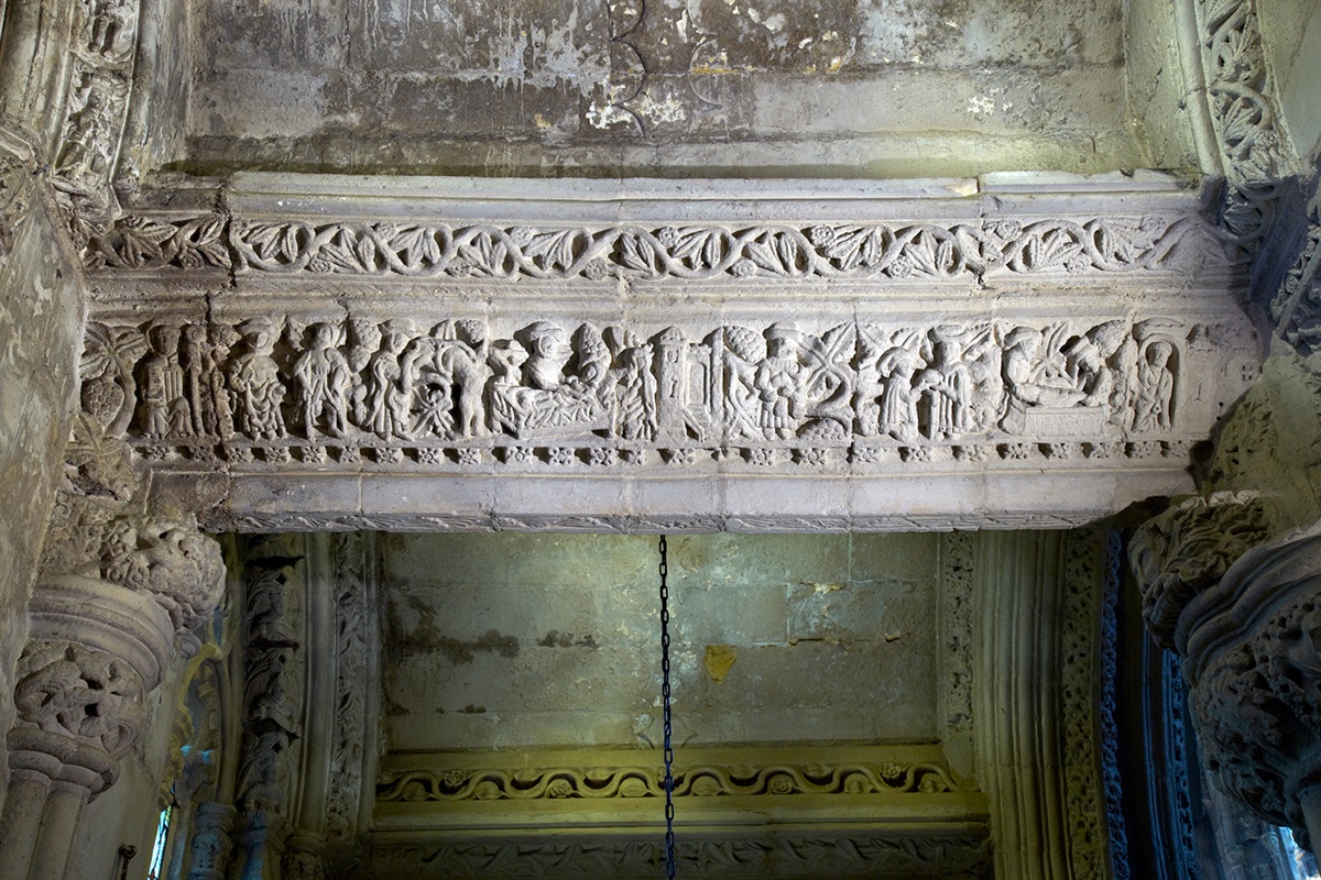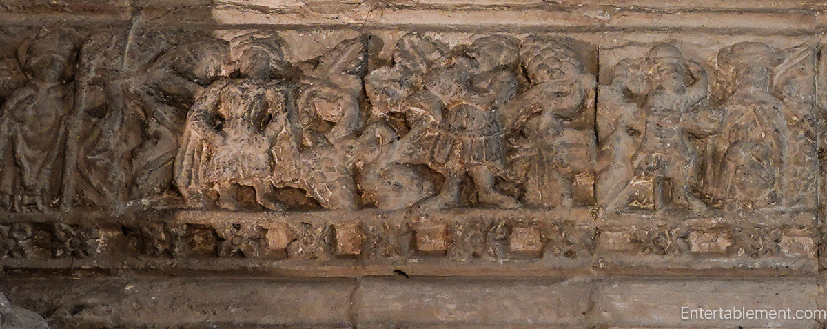For balance, there is another lintel showing the seven acts of mercy. From left to right, you will see a bishop performing the following acts of mercy: