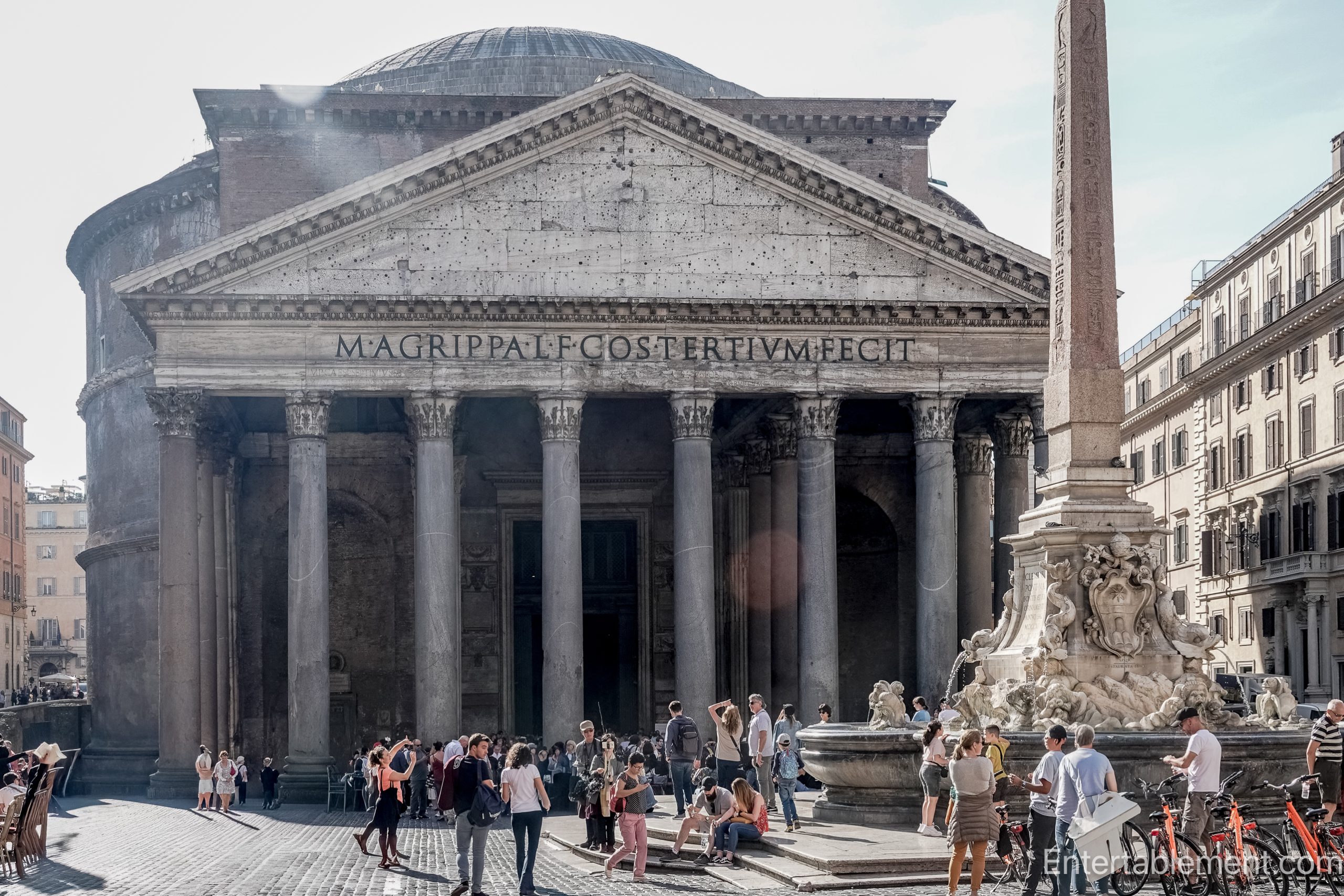 From the outside, the Pantheon is frankly unprepossessing. A heavy cylinder with a classical porch awkwardly grafted on. It bears a striking resemblance to a hedgehog house with columns. And then there is the inscription on the portico—M·AGRIPPA·L·F·COS·TERTIVM·FECIT.