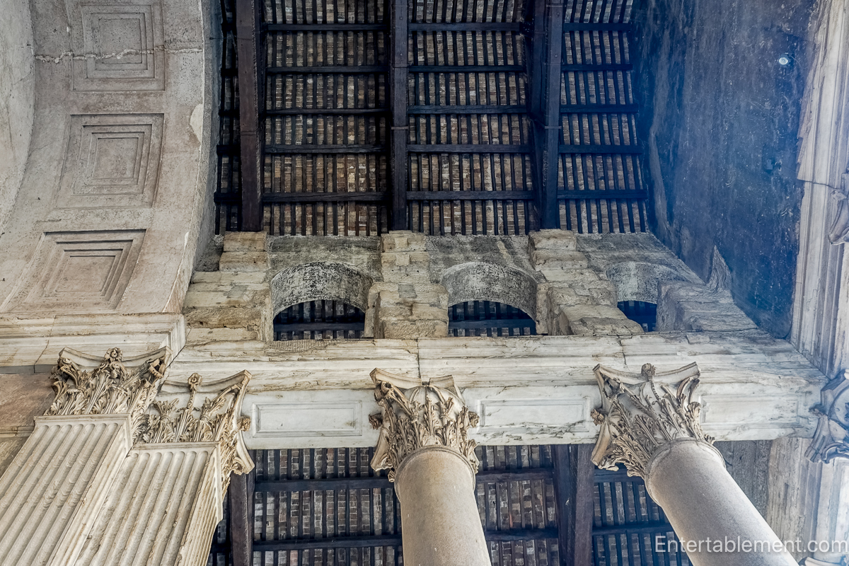 Nothing about it suggests what waits inside. If you didn’t already know its reputation, you might walk straight past without a second glance. And if someone wonders why the porch’s rafters are bare, that’s part of the building’s story too — its materials have played more than one role in Rome’s architecture, quietly circulating into other places of power.